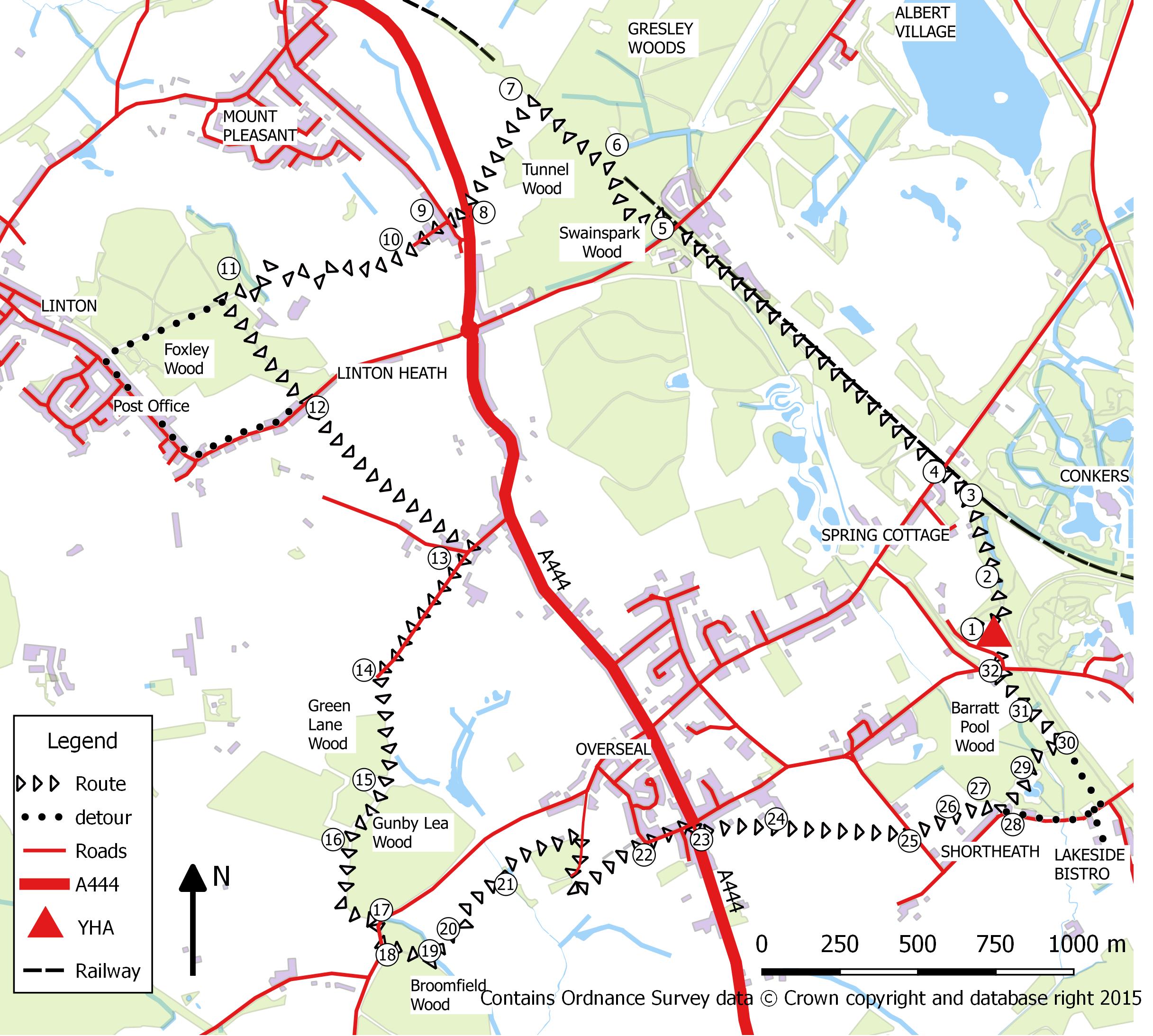 | Follow the path up to the right through a metal gate to enter Foxley Woods (11) . Then immediately turn left... |