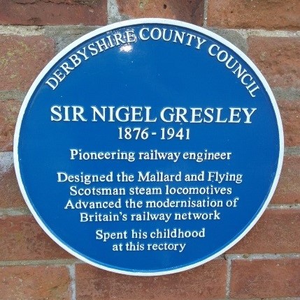 see a blue plaque on a wall on the other side of the road to Sir Nigel Gresley