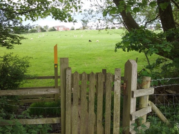 to the footpath that leads straight across the large field towards a gap in the